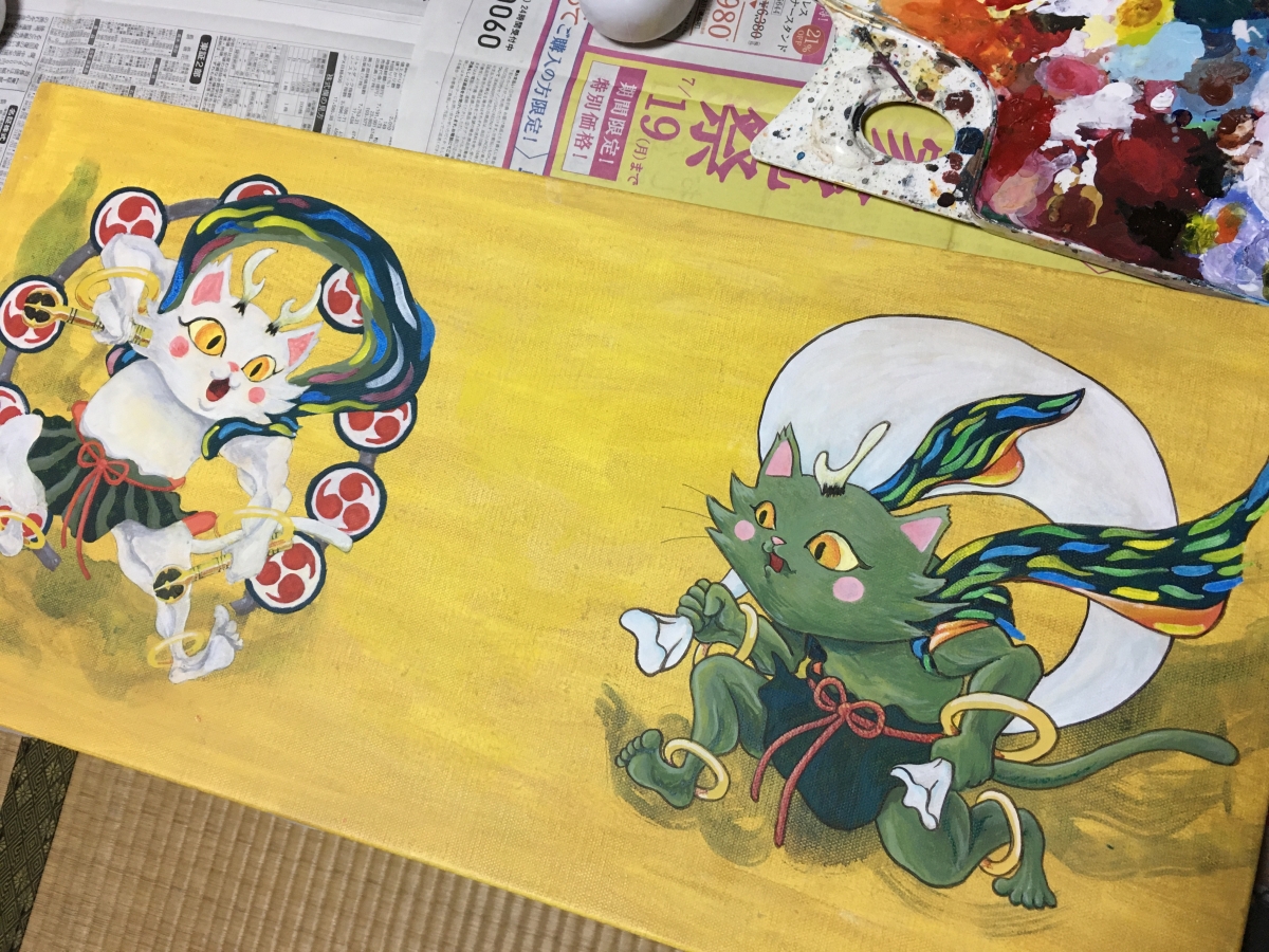 まあぼん 風神雷神図の制作。2021.07.22 投稿者: murbo 投稿日: 2021/07/232021/07/23 まあぼんでコツコツ描いています、風神雷神図。そろそろ完成の日が近づいてきました。近いだけで完成はしていません。あと輪郭とか細かな描き込みと修正です。 関連記事: まあぼん風神雷神図の制作四日目。 風神雷神図完成したよ。 風神雷神と青龍。