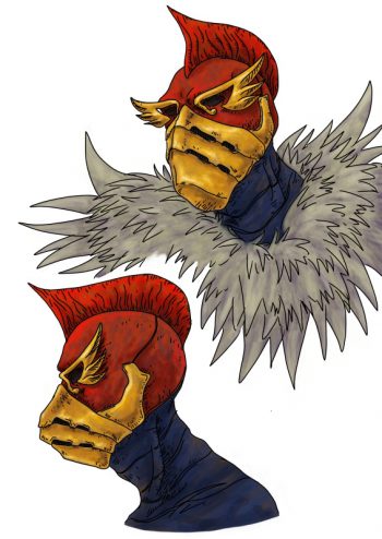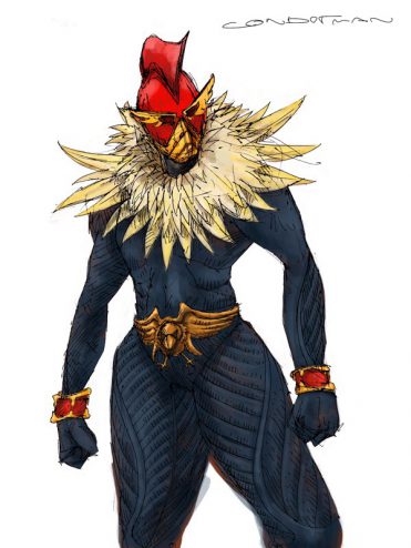 描いた絵はコンドルをうっかり調べてから描いた。コンドルは黒いので黒くして、首から肩にかけて白い羽根にして、頭もコンドルの如く赤くした。バックルは金属で出来ていてめちゃくちゃ重い。しかし、コンドールマン変身すると重さを感じずに身につけていられる。仮面ライダーWに登場する仮面ライダーアクセルの武器か、映画のゴッドディーバに登場するニコポルの脚みたいなものだ。このバックルを身に付けていないと身体が腐ってくる。元々半死半生の状態をこのベルトをつける事で、生き返っているのだ。腕と腿の羽根の模様は展開して飛行できるようになる設定で、もう全然コンドールマンじゃないな。