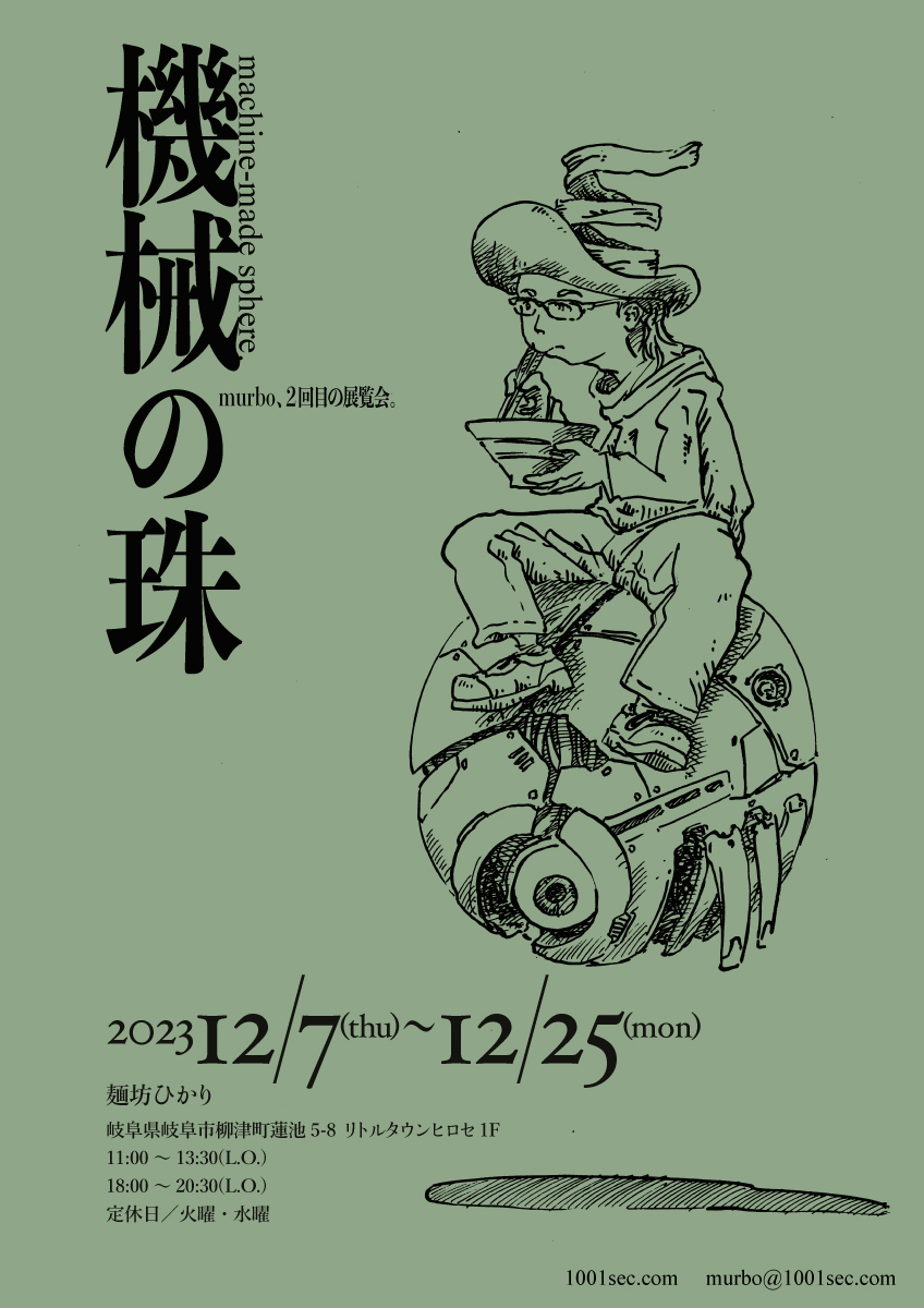 お知らせ 12月の展覧会のお知らせ。 投稿者: murbo 投稿日: 2023/11/272023/12/25 機械の珠期間/12/7(木)~25(月)会場/麺坊ひかり時間と休日は麵坊ひかりの営業時間と同じです。会場は飲食店ですので必ず注文してください。 麵坊ひかりの丸いマークをデザインしました。キャラクターもデザインしましたよ。ということで、お世話になっている場所での展覧会です。点数は少なくなっていますが、オーナーシェフに選んでもらった特別版です。見に来てね。 Readers who viewed this page, also viewed:『機械の珠』展覧会のお知らせ。 関連記事: 『機械の珠』展覧会のお知らせ。 展覧会のお知らせです。 展覧会をラーメン店でやります。