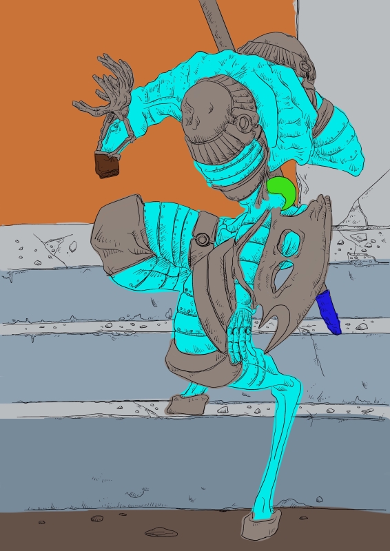 色塗りの途中経過。このように先に補色を塗ります。補色かどうかはともかく、Procreateで描く場合はPhotoshopで言うところの背景に塗ることが出来ず、常にレイヤーに描くことになるので、先に100%不透明な色で塗っておくとあとから透けないのでいいんじゃないかと。特に切り抜きで使いたいときは対策しておいた方がいいんじゃないかな。まぁ、全部最初から100%不透明で塗っていれば一々考えることないが。