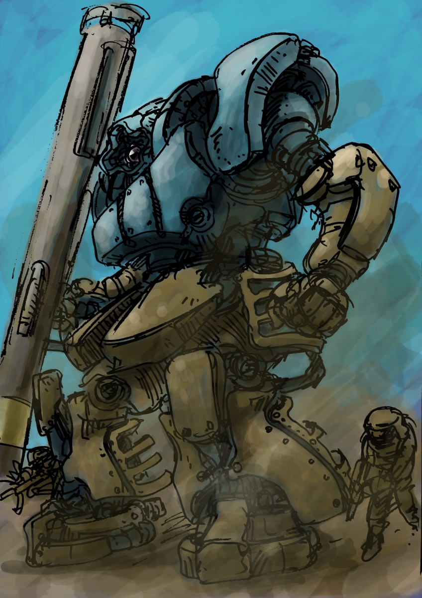 装甲が厚いのは前面だけでよく、背面はむしろ熱対策に配慮したほうがいいんじゃないかと思って描いた。出来るだけ低重心で急発進や急停車などでずっこけないようにもね。バズーカは使い捨てというか、そもそもバズーカは単なる筒なのだよね。弾がドーン!と出るか、ミサイルを発射するかレーザー発射機にするか描いたわりには不明。いろは上半身が青く、下半身がベージュにような。間のグラデーションを大きくした方がいいかなと言うのが油性ペンがかすれそうになりつつ描いて練習。