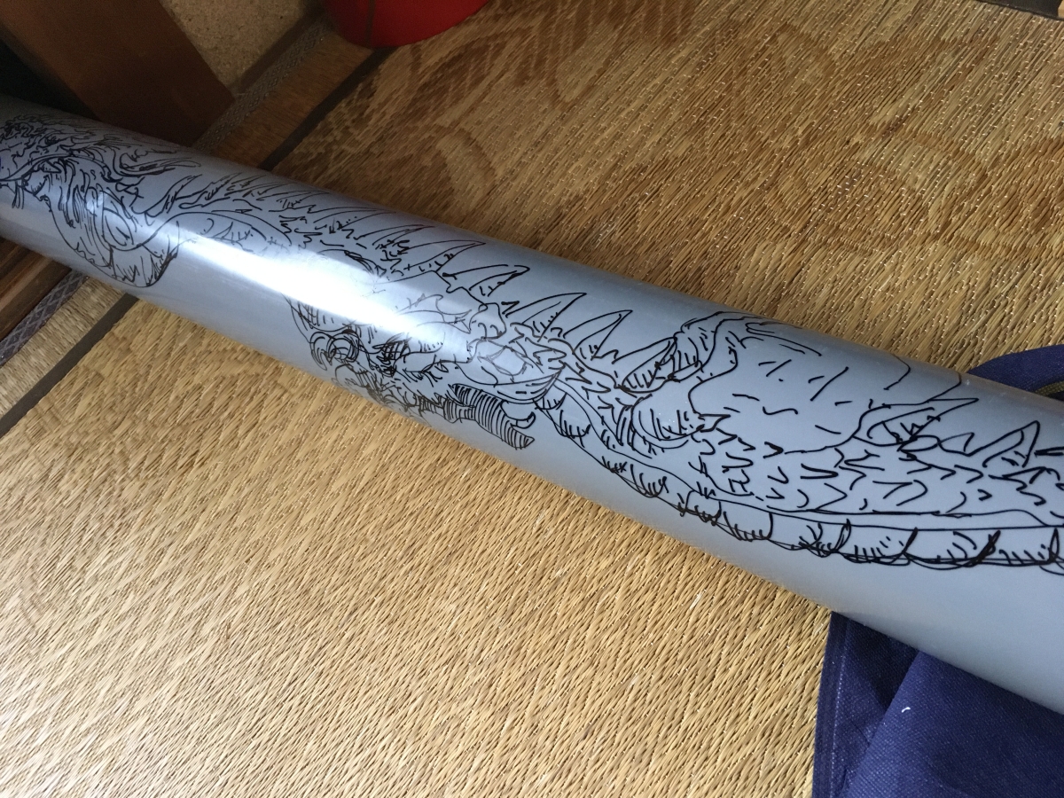 日記 筒に描く。 投稿者: murbo 投稿日: 2022/12/262022/12/26 まあぼんで描いた麒麟の絵を格納している塩ビ管に途中まで描いた龍を全部描く。頭だけ描いてそれっきりになっていたのだ。違うマーカーで描いたので線が細くなっているが。麒麟の絵を展示したその場に置いても多少は謎ではないかと思ってな。荒い筆致だが思ったよりすいすい描けた。早く描けばよかったな。 関連記事: 描いたら塗っている練習 油性ペンの練習。 007とスタートレックで思い出す人。