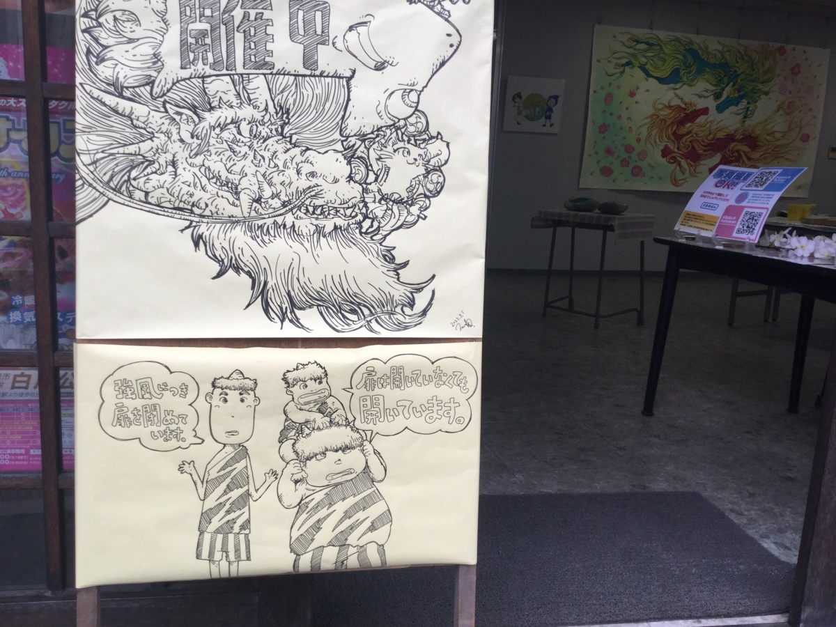 まあぼん まあぼん、九日目。 投稿者: murbo 投稿日: 2022/04/152022/04/15 展覧会、九日目です。雨降っています。 風があまりに強いので扉をあけっぱなしにできなくなりました。絵が飛んでいきます。そこで、扉を閉めているアナウンスを描きました。下書きを消すのが面倒なのでいきなり描いています。 紙にマーカー(顔料インク) 関連記事: 円徳寺会館への道のり。 まあぼん、四日目。 まあぼん、新聞掲載。
