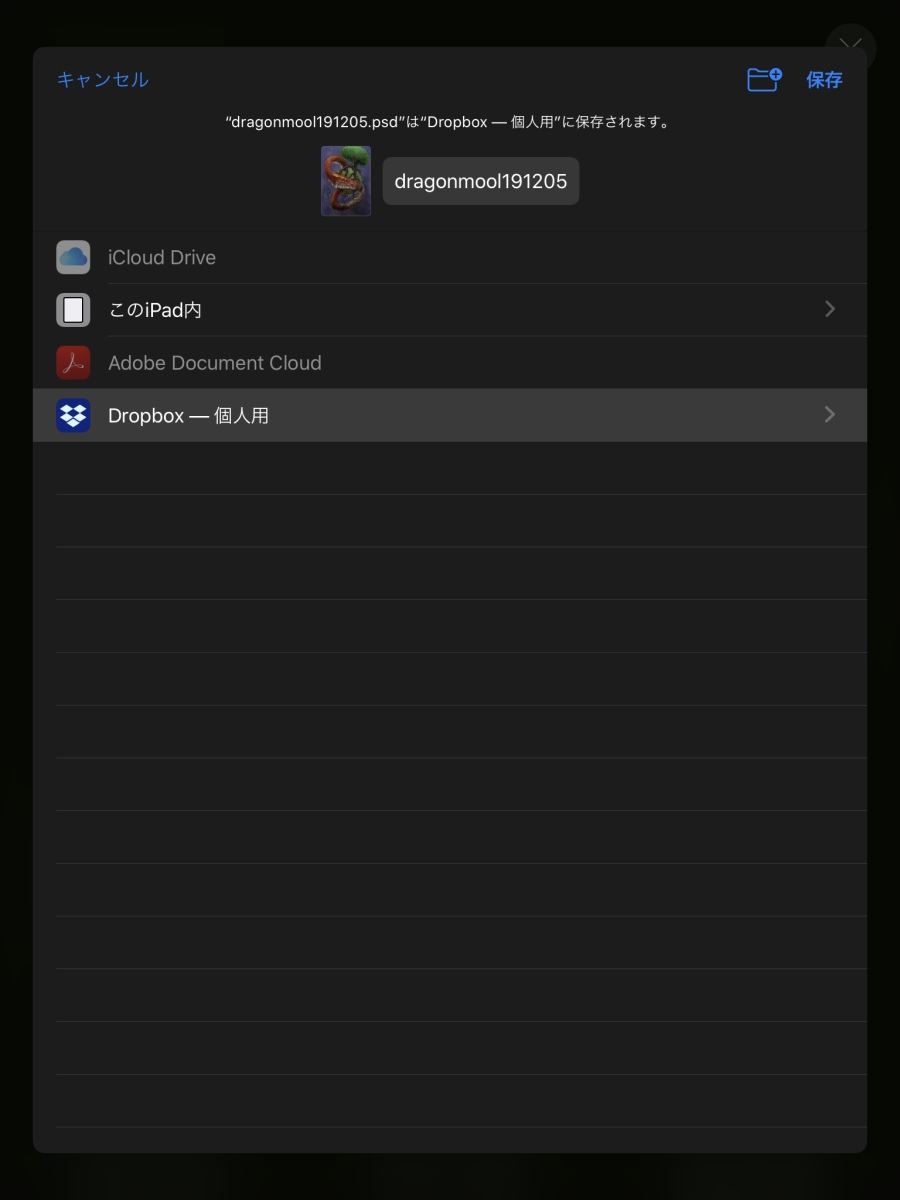 paint tools ProcreateからpsdでDropboxへ書き出す件191207 投稿者: murbo 投稿日: 2019/12/072019/12/07 最近ProcreateからPSDフォーマットでDropboxへ直接書き出せなくなっていたのであれこれ回避策を考えていたが、いつの間にか治っていた。 関連記事: ProcreateでPSD共有できない問題の解決方法 ProcreateからDropboxへ送れない問題2019/11/19 ProcreateからDropboxへPSDで送る方法2019/11/19