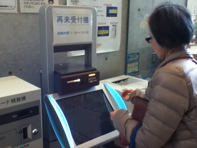 受診料金などを支払う場所。自分で操作して支払うマシンはハード的にはかっこよく仕上がっているが表示画面のルックスは大昔のセンスだ。ルックスと書いているのはインターフェイスとしては問題なさそうだからだ。自分で使っていないのでつかった人の感想だ。特別困っていないようだったので悪くは無いだろう。ただ見た目が大昔だ。隣の画面の順番待ち表示もシステムとしては今風だろうが、グラフィックデザインがデザインされていない。本当に色が絶望的にセンス無くて具合悪くなりそう。遠くからの可読率を上げたいならゴシック系を選んだほうがよいし、無駄なグラデーションも誤認を呼ぶ。あ、グラデーションが駄目ではなくて、読みやすくするために利用したらいいんですよ。