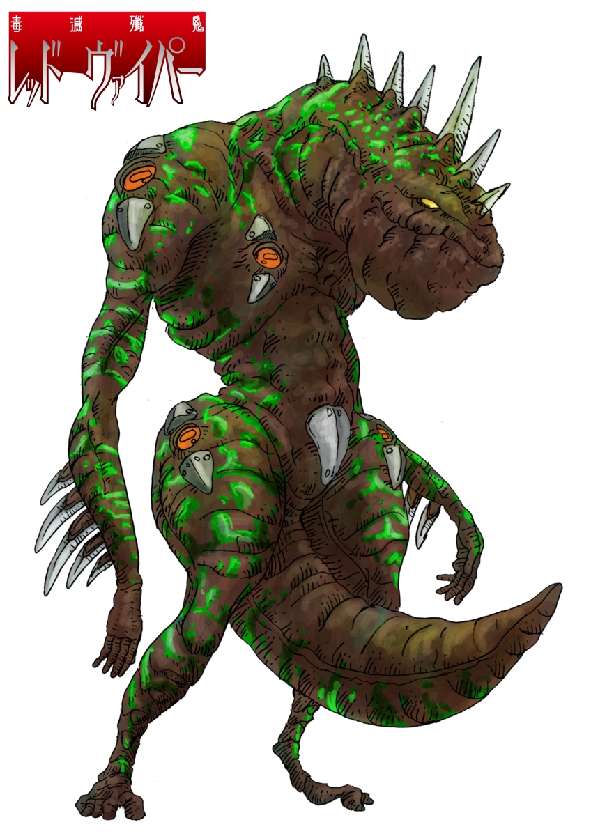 毒滅殲鬼レッドヴァイパー GILA LIZARD 投稿者: murbo 投稿日: 2019/09/042022/06/16 GILA LIZARD《ギラ リザード》、ドクトカゲの怪人。ノコギリ状の刃を付けている。実際のドクトカゲはピンクのようなベージュのような色で斑になっていまして、そのままやると健康的に見えるので、できるだけ毒々しい感じにするために緑にしました。,GENEXTLAB開発、リキッドメタルは攻撃型三角、エナジーバルブはオレンジ。ジェネクストの中では後半に開発され、全体のバランスも良いため複数体稼働している。 シャープペン0.9mmのドローイングにprocreate(iOSアプリ)で着色。 Readers who viewed this page, also viewed:ARMOR RHINO white蜘蛛怪人ARMOR RHINO black 関連記事: 蜘蛛怪人 ARMOR RHINO white ARMOR RHINO black