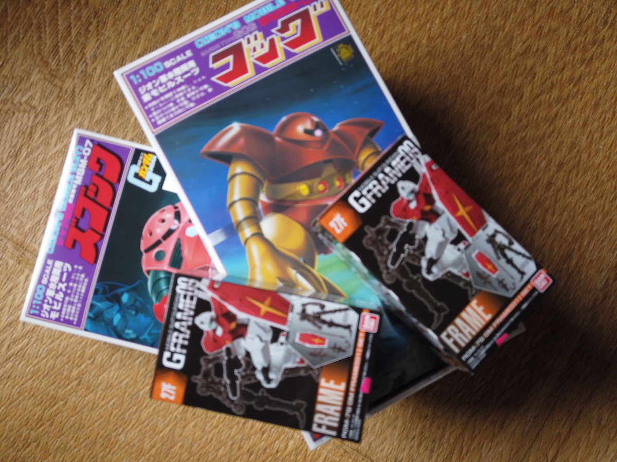 上のGフレーム二つは半額で投げ売りされていたのでさっそく回収するように購入。塗装中のGフレーム版ガンダムとガンキャノンのフレームにアクリル塗料を塗ったら関節がもろもろと千切れるように壊れたので買い足したのだ。暗い色の内部構造が納得いかなくてね。明るい色で塗っていたのでした。