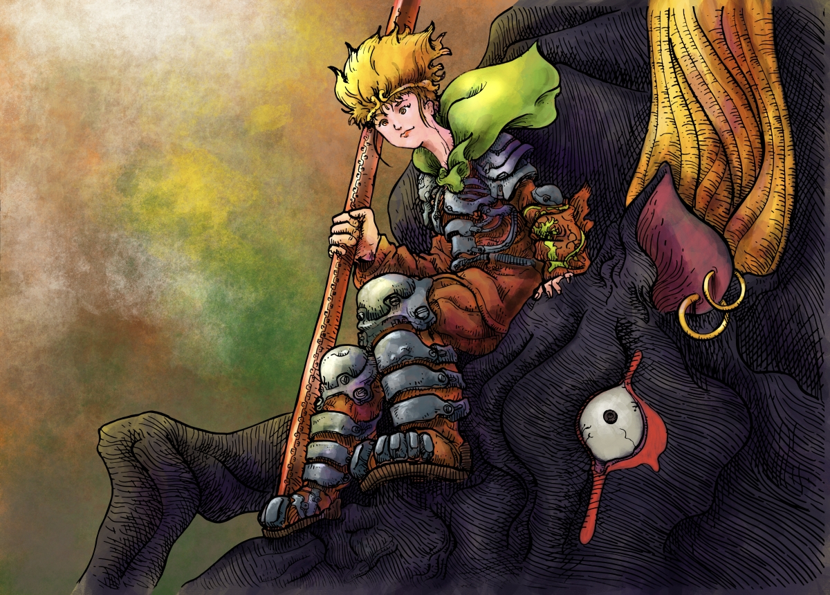 Picture GOKWOO 1 投稿者: murbo 投稿日: 2023/01/182022/12/24 特別指定がないまま描かなければならなかったので、退治した牛を描くにはどうしたらとか考えての孫悟空と牛魔王。多分牛魔王の意味は違うと思うが、かなり解像度低めの解釈として。スケッチとしてB2のレイアウトペーパーに描いたものを撮影して彩色している。 紙にマーカーでドローイングにProcreateで彩色。 孫悟空は描いていたね。 サル発見 関連記事: 2023年6月16日の制作。 2023年6月17日の制作。 2023年6月19日の制作。