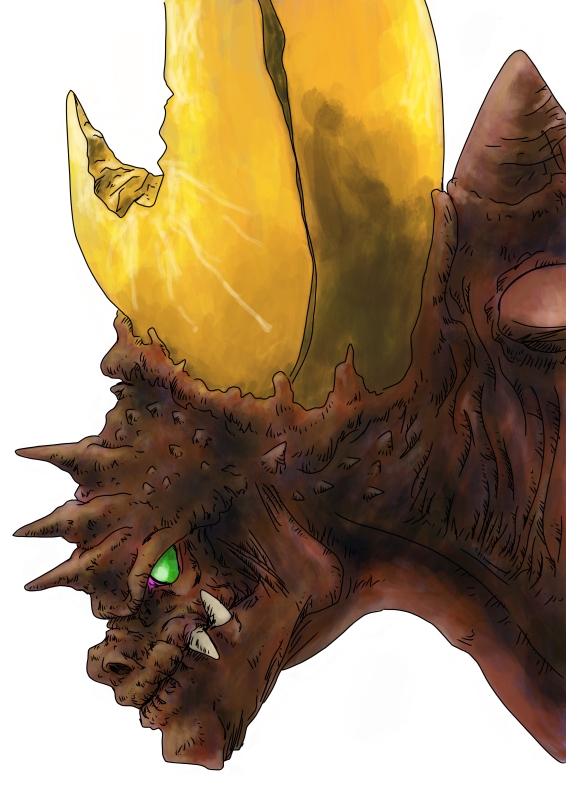 まだまだ落ち込んでいるので以前描いた怪獣のを思い出して描いている。思い出すと言っても意図的に変えている。当時は怪獣とは恐竜のようなものだ。有態に言えば恐竜に角が生えていれば怪獣だくらいな発想だ。殆どの人がそうじゃないかと思っている。というのもSF、特撮マニアを自称する現在五十代のおっさんですら自分で考えた怪獣は直立した恐竜に角をたくさんつけたものだ。実際そうだった。そういう人は怪獣は恐竜じゃないとしきりに言うが、どこが違うかは言わない。その違いは、僕は恐竜は実在し、怪獣はおっさんが考えたものと考えている。おっさんじゃなくてもいいけど。