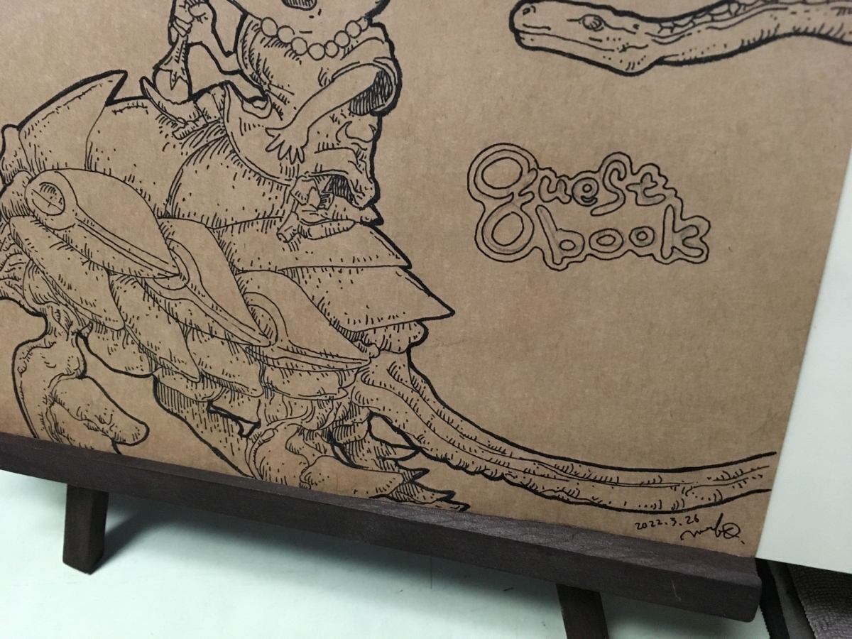 まあぼん まあぼん、(てん)のゲストブック。 投稿者: murbo 投稿日: 2022/03/282022/03/28 今年しばらく活用することになる展覧会用ゲストブックは芳名帳として売っているよくあるあれは高いので無印のラクガキ帳にしました。紙の束だったらなんでもいいじゃん。何でもいいけど、それだけでは何なので表紙に描いときました。 関連記事: キャンバス買ってきた。 まあぼん、タロットカードの制作日。210218 まあぼんのモーションロゴ。
