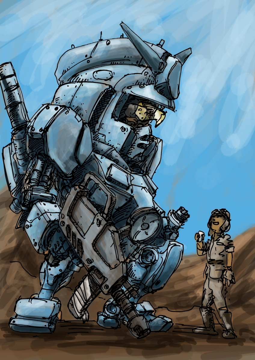 隣の人はこのガンダマーの大きさを表現するためにいる。何をするわけじゃない。描いてから思ったのは巨大な人型機械の迷彩は青から茶色、もしくは青からグレーにしたら自然な感じになるね。それがヒロイックに格好いいかは疑問だが。