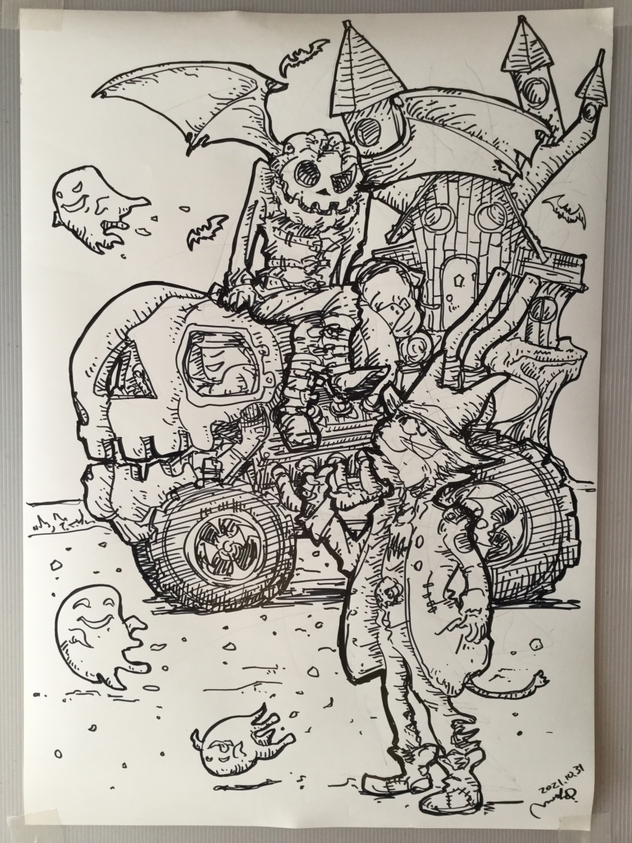 描こうと思ってそのまま紙を放置したままになっていて、もうハロウィンが終わってしまうので、慌てて描いた。