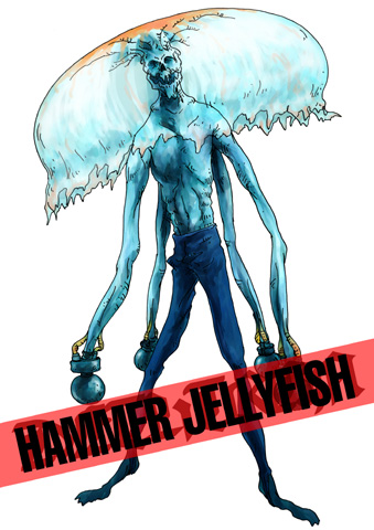 自主制作・metal charged creatures HAMMER JELLYFISH 投稿者: murbo 投稿日: 2015/03/232022/06/23 ハンマークラゲ。もう元ネタは全然関係ない。全身が半透明で心臓を銃で打ち抜いても死なない。 頭部を覆う透明の部分は帯電していて防護に使われる。ゆらゆらと揺れながら腕の鉄球で攻撃する。 火力発電所を襲撃するがレッドヴァイパーに腕を切り落とされ、コアの入った頭部を潰されて阻止される。 FLAME SQUIDなどいくつかのバリエーションがある。 [blogcard url=”http://www.1001sec.com/murbo/flame-squid/″] 関連記事: フレイムバット MACHINE GUN SNAKE ZARIGANI AX