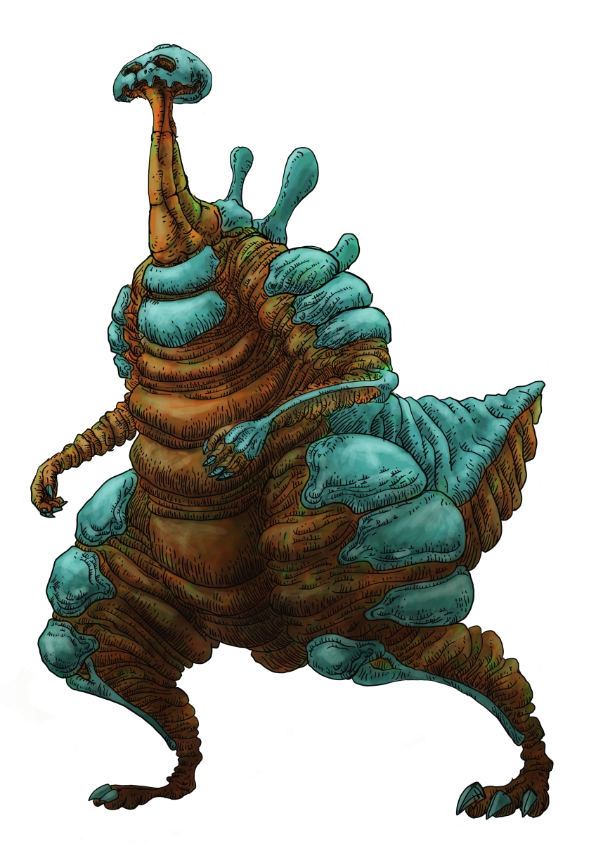高い位置に割れたどんぶりのような頭があるのでハイドン。動きやすいように内側になる部分はぶよぶよしている。青い部分は硬い骨のようなものという設定。全高46m