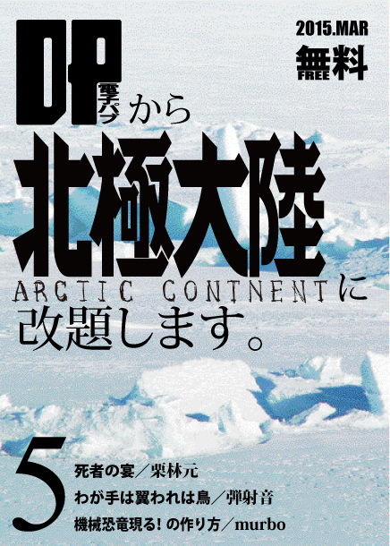 お知らせ・自主制作・電子本・北極大陸・北極大陸バックナンバー 『北極大陸』第五号を発行します。 投稿者: murbo 投稿日: 2015/04/012017/02/28 自己出版のお知らせ電子フリーペーパー『電子パブ』は第五号から『北極大陸』へ改題して発行します。 お知らせなのに内容は普通に小説が連載されています。 栗林元さんのサスペンス『不死の宴』が連載三回目。遂に戦闘が始まりました。弾射音さんの『わが手は翼 われは鳥』、僕の『機械恐竜現る!の作り方』は共に五回目。『機械~』はアイアンエイリアンというメカを紹介。絵が寂しかったのでページを延長しております。 PDFなので印刷しても読めますよ。ぜひ。 北極大陸第五号は下記のリンクからDL出来ます。 関連記事: 電子パブ第二号 電子パブ第三号 北極大陸 第8号