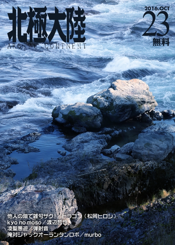 電子フリーペーパーの北極大陸第23号は、ドラゴンさんのコラム、他人の畑で雑句ザク! はあなたが知らないほうがいい世界です。渡辺哲也さんによる、kyo no moso。未公開になった企画のロボットです。弾射音さんの凌聖愚遊は第15回目。僕の俺対決シリーズ。今回は対ジャックオーランタンロボ。表紙の写真は清流長良川。清流のわりには波が激しいです。と言うことで、ダウンロードしてね。