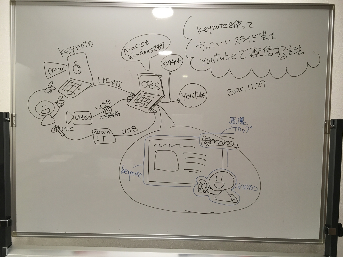 スライド芸とはプレゼンテーションとも言い換えられる。モニター画面とビデオ画像を合成出来ればOKなんですが、モニター画面のスライドをコントロールしたい場合、keynoteが便利ということでkeynoteの利用のためにコンピュータを2台にします。HDMIで入力したらいいやんかと描いたけど、HDMIで入力できるのは稀なのでここもあいだにキャプチャーユニットを挟んでUSBに変えたほうがいいね。パワーポイントを使うならコンピュータを分けずに一台でいいかもね。
