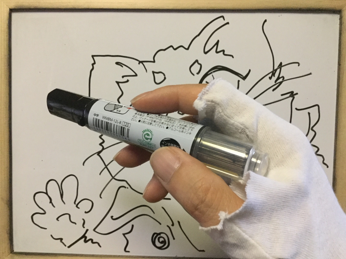 大きな場所に大きく描く時はマーカーを持っているように持ちます。人差し指と親指以外も結構大切でペンを握り込まないことです。とにかく力を入れない。ペン先から遠くを持つのは支点が変わるからです。大きく描く時は肘や肩を支点にして描きます。あるいは腰を支点にするときもありますね。