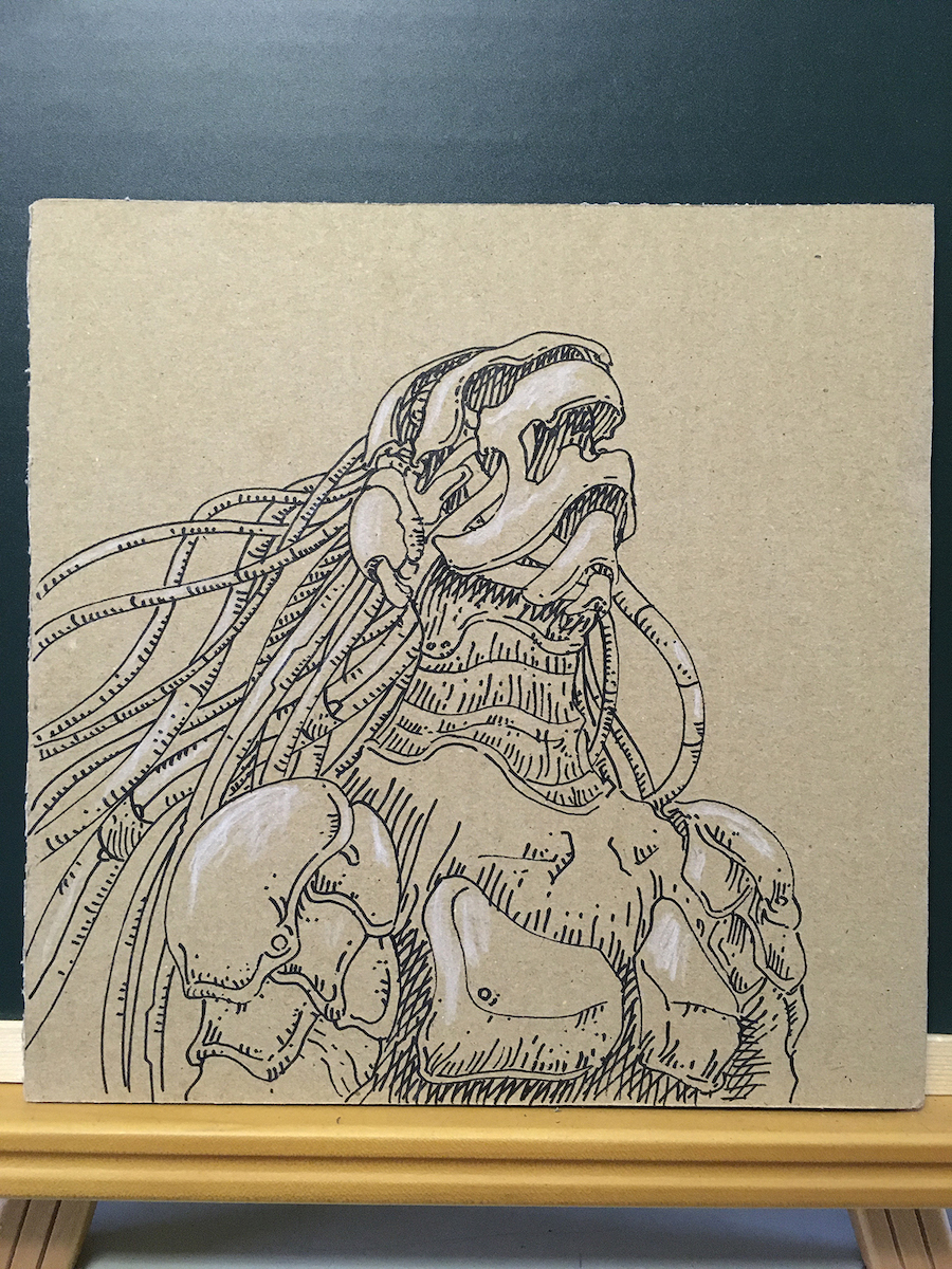 14cm x 14cmのダンボールに竹ペンでドローイング。白は色鉛筆。