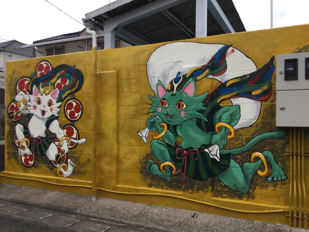まあぼん 風神雷神図完成したよ。 投稿者: murbo 投稿日: 2021/08/262021/08/27 できた。2021年8月24日の出来事。ずっと二週間ほど雨が降っていたので作業できず。晴れ間があってもお互いの事情で制作できずだったので、タイミングのあったこの日に雨が落ちない間にさっさとやろう!ということで、制作。 久しぶりに現地へ到着すると舗装工事をしていました。午前中で終わったのでその間は調色したり、下書きしていました。細かい話はそのうち自分で編集している電子フリーペーパー北極大陸で書きます。 関連記事: まあぼん風神雷神図の壁画制作開始。 まあぼん風神雷神図、制作二日目。 まあぼん風神雷神図の制作三日目。