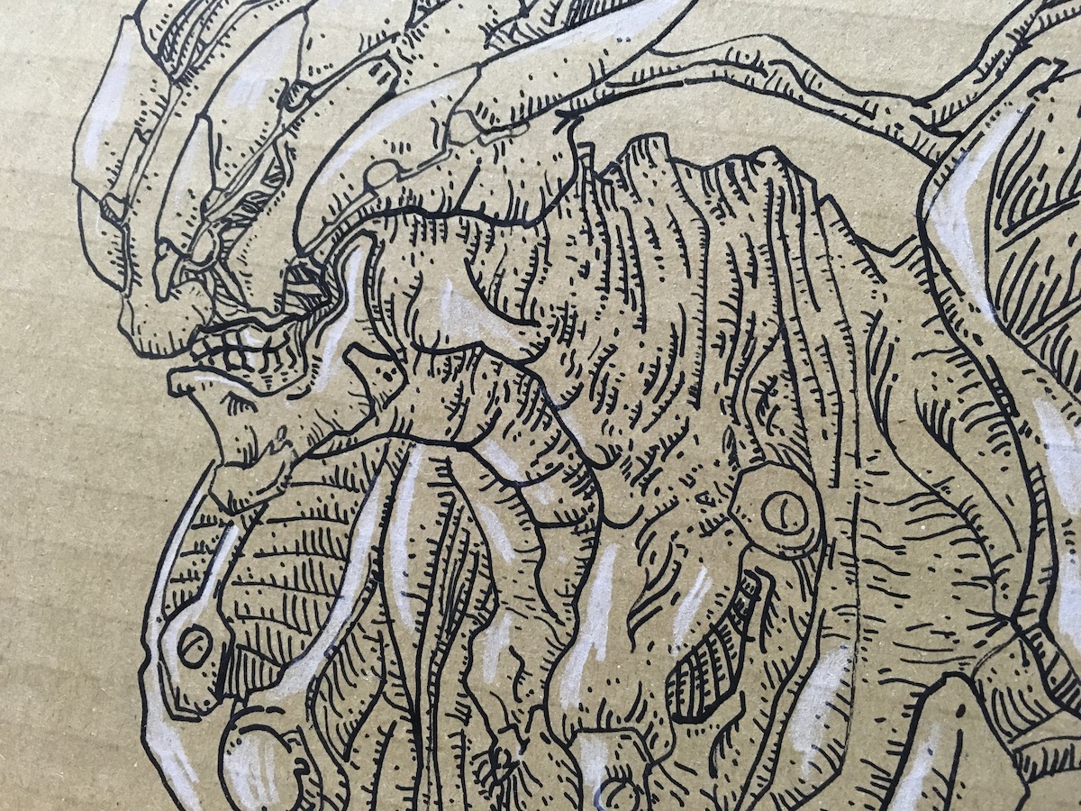 日記 画材をお試ししたが。 投稿者: murbo 投稿日: 2024/08/202025/02/07 ガラスペンで描き込みをしようとお試ししてみたが、あまり線が細くなかったことと、当たり前なんだけど、クッションが全くないので描きづらかった。絵が14cm四方で小さいこともあって描き込みにはあっていなかったな。太い均一の線が欲しいとか、50cm四方くらいの紙だといいかもしれない。ということで、今回の画材は竹ペンだけで描くよ。 関連記事: あれこれお試し中。 241014. 気力がない時の練習とお試し。