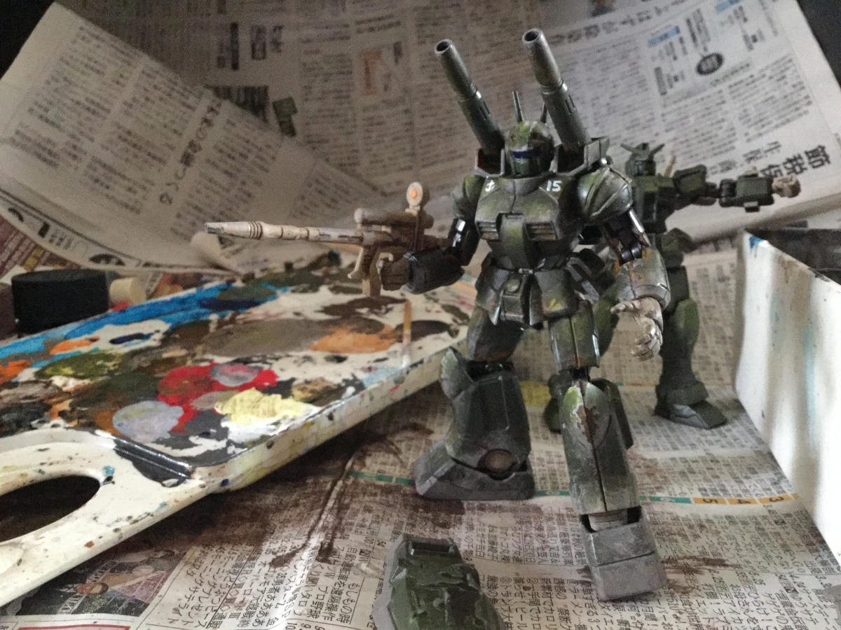 やっとこさGフレームのガンキャノンを塗った。とりあえず撮影したのでパレットも新聞紙も片付けず。