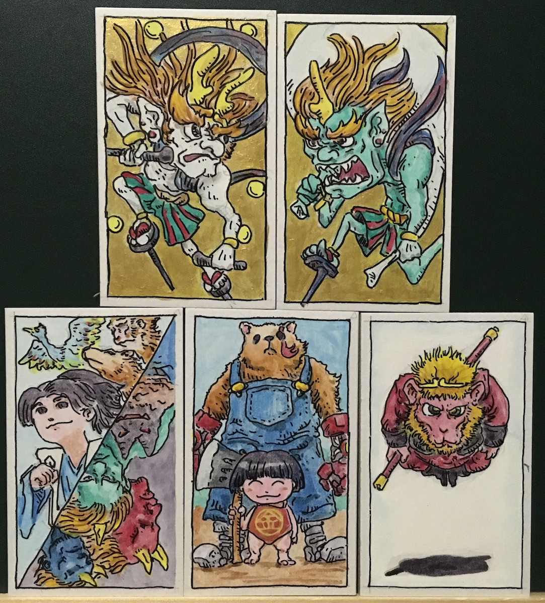 桃太郎と三匹の家来に鬼軍団。トランプの絵札的にレイアウトしました。オリジナルの雰囲気そのままなので練り直してまた描きたいです。