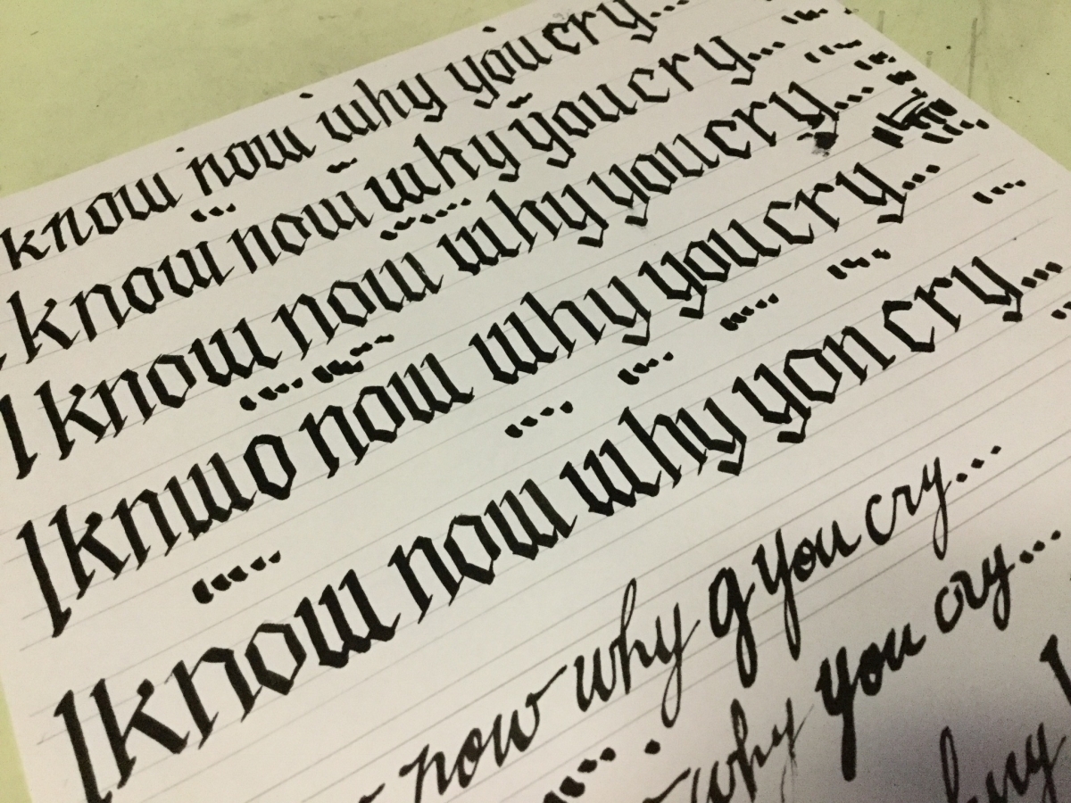 そうやって無駄に別なことをしているのがこのライブドローイングの練習に描いていた絵にタイトルをつけてその字を書くというもの。わざわざカリグラフィペンで書かずともペイントソフトのカリグラフィペンで書けばいいのだ。しかし、二文字書いたらインクが無くなる、またはインクをつけるとぼたつくので一度試し書きをしないとまともに書けないペンでどういうことか書いている。ケチって墨汁なのでなかなか乾燥しないことも欠点だ。そもそも紙に引っ掛かりやすくて書きづらい。なんで欠点ばかりの道具で描いているかと問うならば、練習だからだ。カリグラフィペンの特性を身に付けたい事もある。それにしても同じ文字が何度も続く文だな。