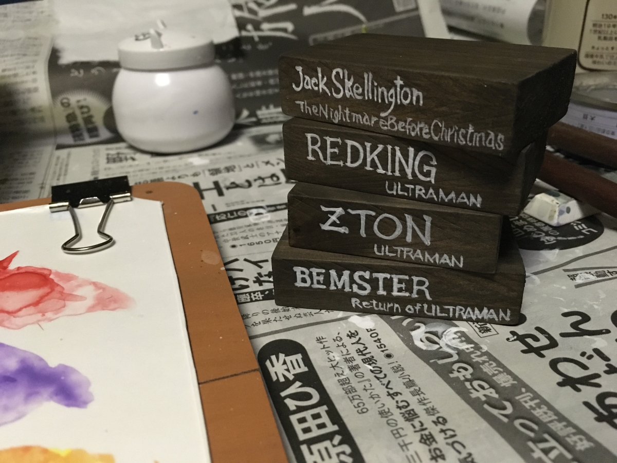 プラモ ベースを作るよ。 投稿者: murbo 投稿日: 2023/05/172023/05/17 この前まで塗装していた塩ビ製フィギュア、消しゴムとか言われがちなあれに台座をつけようと思います。 在庫の木を切り出して水性のオイルステンぽいものを塗りました。水性のオイルステンてなんだよそれはw 文字はアクリル絵の具で筆書きです。久しぶりに書くので伸びの悪い絵具は結構しんどいです。ありがちなことで慣れてくると書き終わりです。 乾燥したら接着剤で固定して完成です。ひとつづつの撮影はまた後日。 関連記事: 20201年6月21日の制作。 ベースの地面の制作。220906 まだ地面を作っている。220928