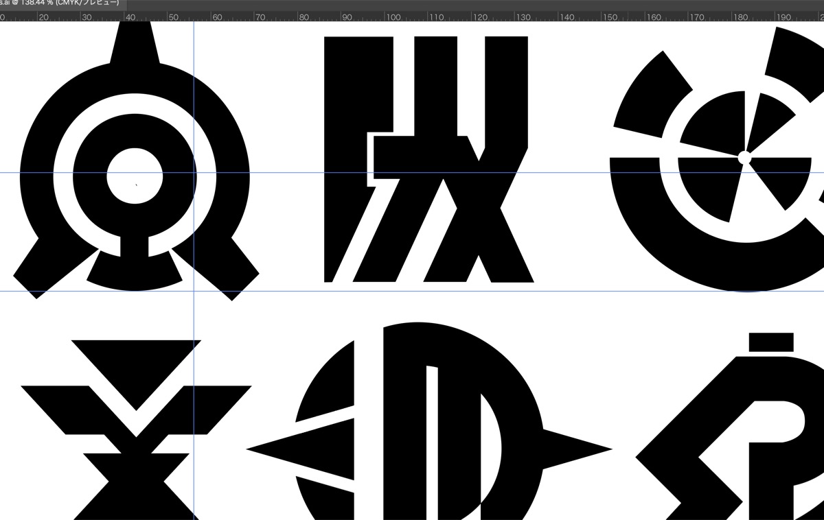 展覧会用に拾貮ノ戰機󠄁という題で絵を描いていまして、十二体のロボットを描くだけのことですが、それぞれにマークをつけようと考えました。このように要素というか、デザイン的な部品がいくつかあると作り物にはとても便利なのです。少し時間が空いたらスケッチして、イラレで清書しています。元ネタは十二神将の名前の最初の文字です。既に設定上は十二神将ではなくなっているので漢字として読める必要もなく、感じであることすら意味がないので、むしろ出典不明の謎の形である方が良いと思ってそのようにしています。遠中経過では適当に色をつけていますが、これは制作中に位置関係がわかれば良い程度の意味です。で、これを絵を描く参考にするのです。そのまま使う場面もあるかもね。