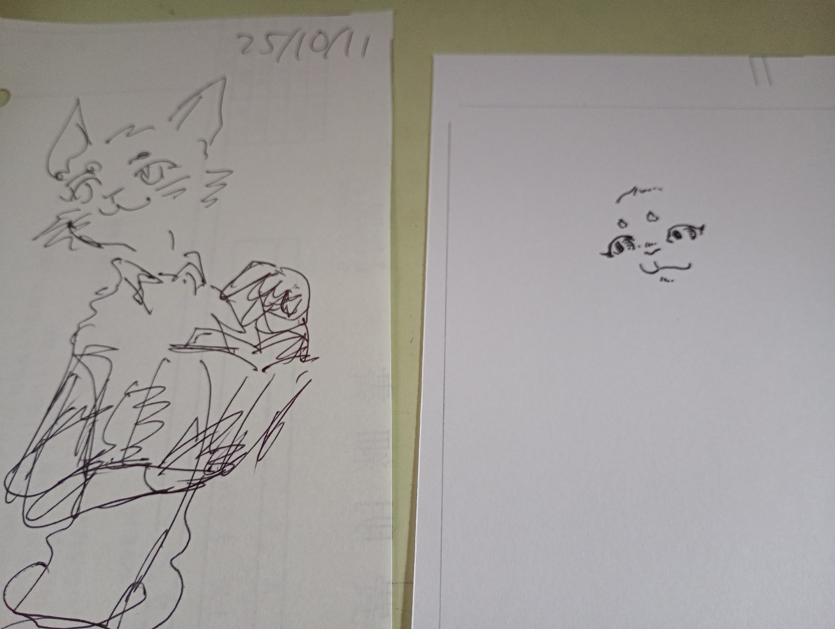 日記 見て描いています。 投稿者: murbo 投稿日: 2025/10/122025/10/12 来年の展覧会用に小さい絵を描いていまして、一旦別の紙に絵を描き、それを見て描いています。見ながら整合性など気にしつつ描きます。何も見ずに下書きなしで描ければもっと早いのですが、なにしろ特に上手くもないのでコツコツ作業です。一旦集中してこればかり描いて、馴染んできたら会期までのルーチンワークにできると枚数稼げます。 関連記事: A-1のフレーム SKETCH BOOK 2024 February 画材をお試ししたが。