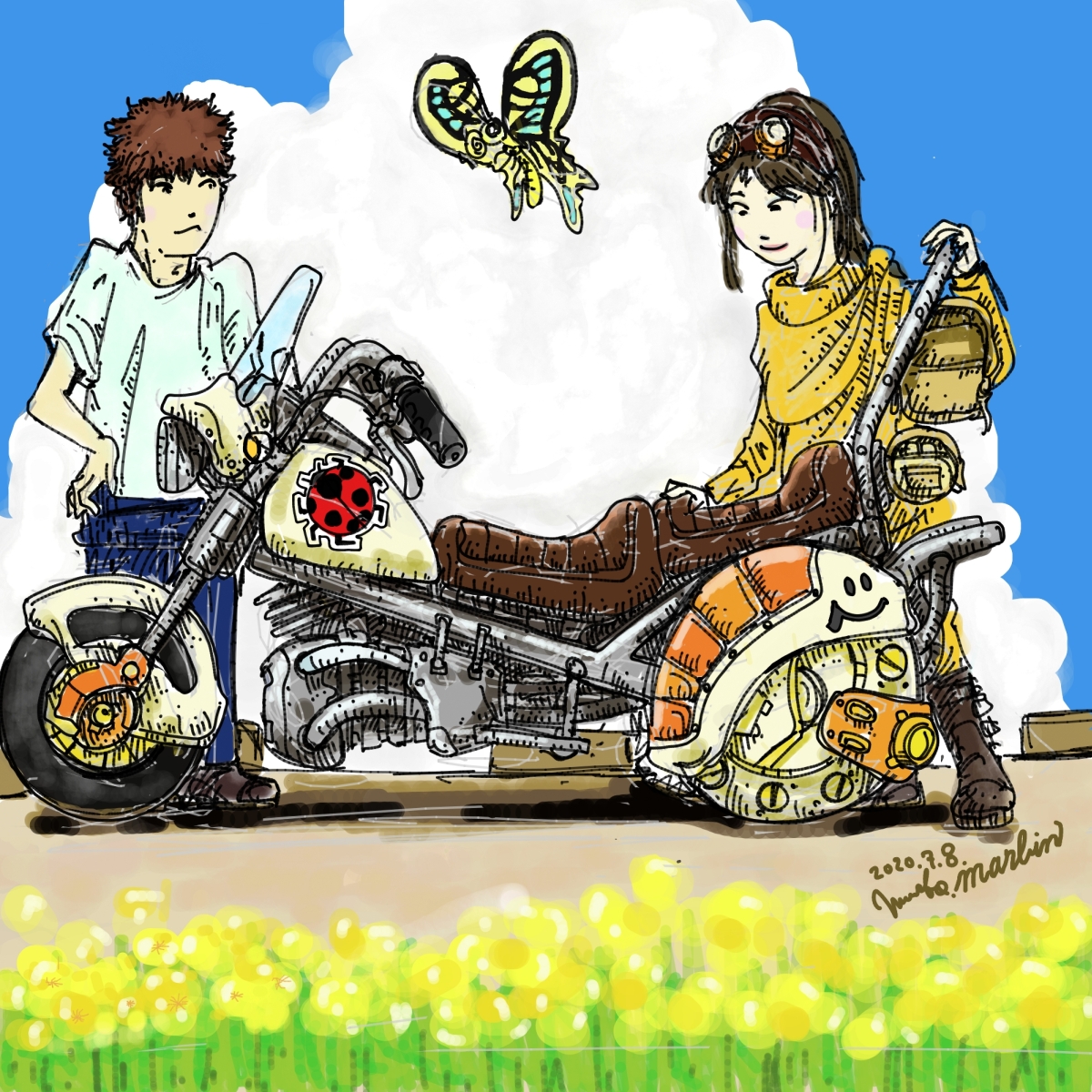 まあぼん 空飛ぶバイクを描くよ!まあぼんのリモートライブペイント 投稿者: murbo 投稿日: 2020/07/092020/07/09 https://www.youtube.com/watch?v=FH-lEayq9iA&feature=youtu.be 2020年7月8日の午後9時に開始したリモートライブペイントの模様。描いた絵はこちら! まあぼんでメカモノを描くのは合わないのではと思ったが以前うさぎ型の宇宙船を描いていたな。反重力トライク。ちょっと手抜きして横から。エンジンなどはその場のアドリブなので設定など考えていないのですね。これから二人で出かけるのか途中なのか、二人の気持ちをつないでいるのが謎の蝶なのか。 関連記事: まあぼんのリモートライブペイント200617 まあぼんのリモートライブペイント06 まあぼんのリモートライブペインティングvol.1