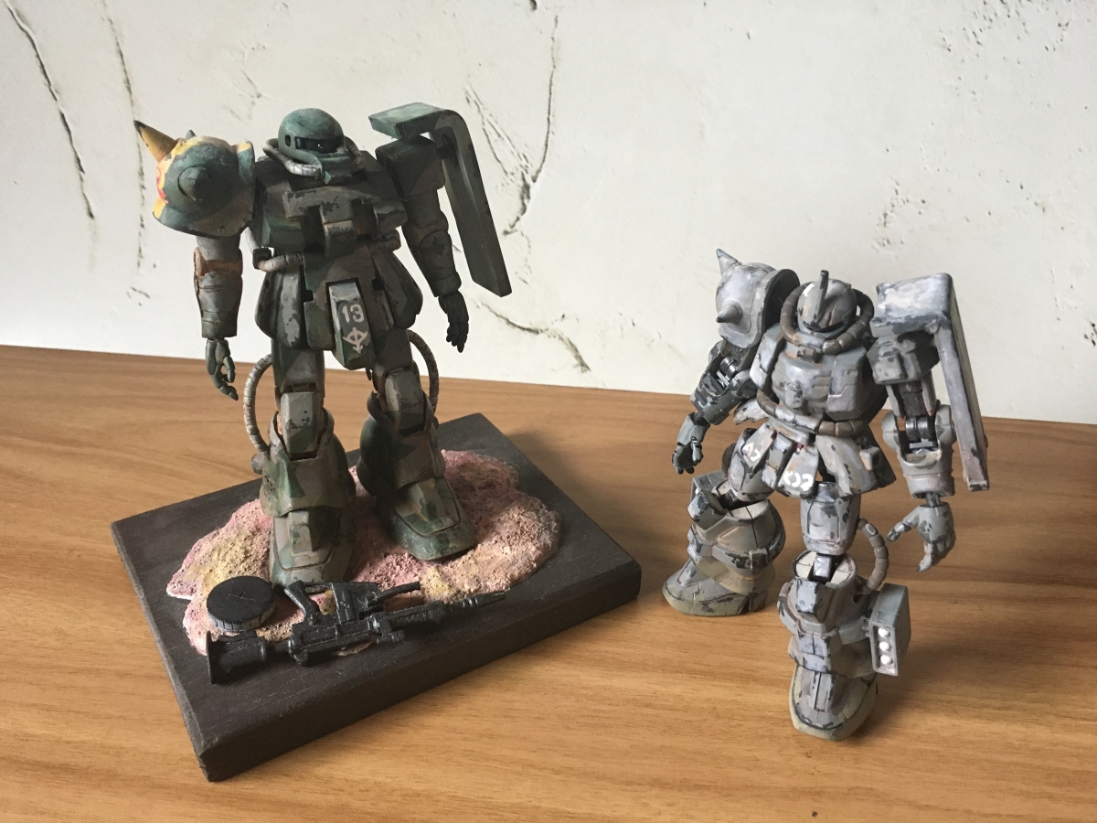 Bクラブの無発泡ウレタンモデルMS-06F2をペイントしたもの。そのまま積み木のように接チャウしたのでポーズがしょぼくなったな。モビルスーツなどのアニメのロボットプラモの胸を張った背筋の良いポーズが苦手でどうにかして姿勢の悪いポーズにしたい。