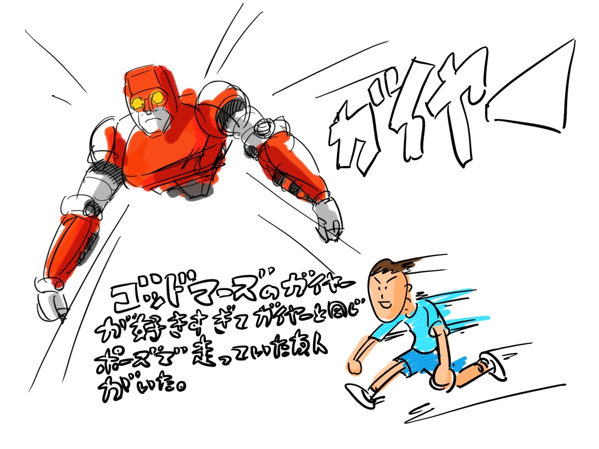 日記 ガイヤー走り。 投稿者: murbo 投稿日: 2018/08/072018/08/07 小学生の頃、友達がゴッドマーズが好きすぎてどんな時もガイヤーの飛行ポーズで走っていた。これがオタクだと思った。そのほかにもゴジラの全シリーズの歩き方をまねる人もいた。オタクの完成形は好きなキャラクターの歩き方をまねることだ。まさか飛び方をトレースするとは思わなかったがな。 関連記事: 昨日のスノーボードの件はアートハウス。 2019年8月2日のランチ。 久しぶりに更新したら、アクセス数が倍になった。