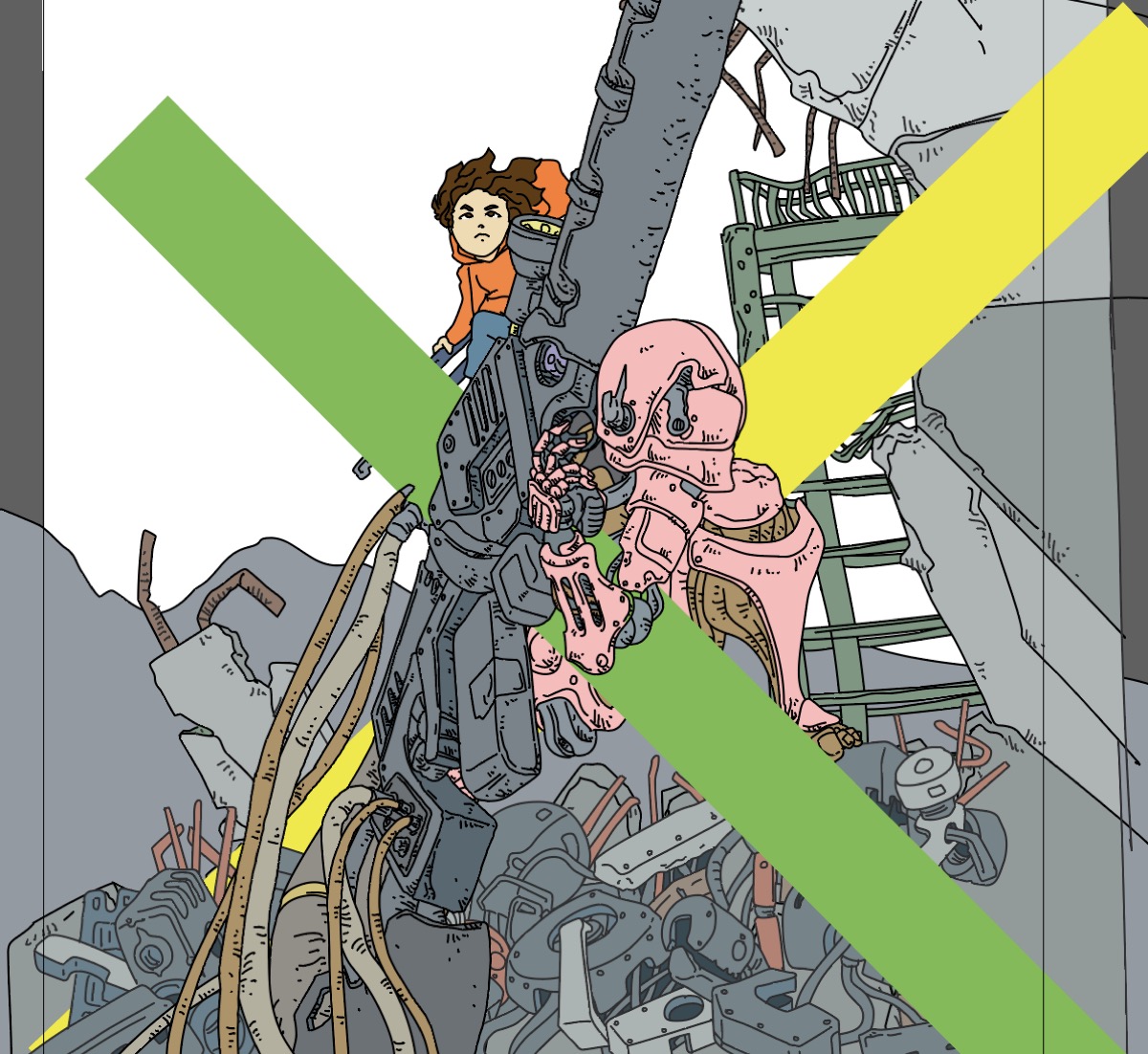 素材の絵が全部できた(と思っていた)ので、レイヤーに分けています。全て同じレイヤーだとこのように黄色と緑のXは上に乗ったままです。全部ではないですが、ある程度の部分に分けて奥行きや稼働するようにしたいのです。