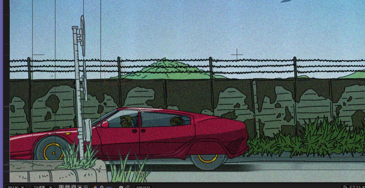 カットをある程度切り出して展示予定なので、それもまだやっていないかった。まだまだやることがたくさんある。車は手前があまりに寂しかったので急遽適当にデザインして描いた。敵(戦う話なので敵がいます。)が移動しているところです。以前作ったグループ展用の3DCGでも似たように車を走らせていた。やることはいつも一緒だね。今回は半重力自動車ではなく、電気自動車的なものとしましょうか。前面にモーターかバッテリーが入っているのでしょう。機械は後ろに積んでいるのが好みだけど、敵のリーダーが乗っているなら後部座席を広めの設計の車に乗るんじゃないかと思って機械ものは前面にある設定です。赤いのは黒いと質感がつけづらいし、敵とか悪いやつとかでも自分のパーソナリティとか趣味性を出したりするんじゃないかの赤。他の色でも良かったが、景気付けに赤くした。