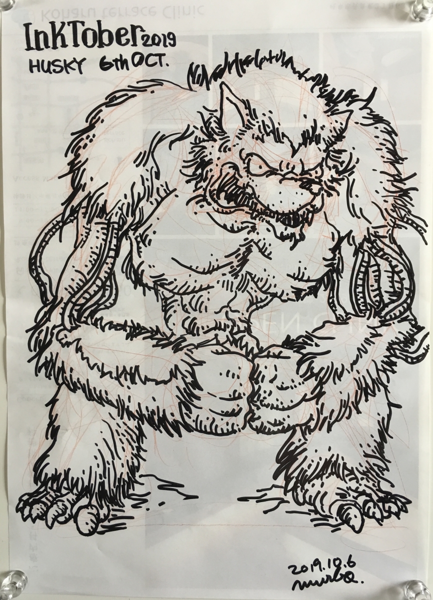 今のところ忘れずに続けているinktober。6日目のお題はHUSKY。一応調べると犬のシベリアンハスキー、声のハスキーボイス、そしてガタイがいいという意味があるようで。最後のは知りませんでした。3つ描くのは面倒なので三要素を合体させてハスキー怪人にしました。面倒なときは怪人です。声は描きようがないものの首元とかきーってなった感じを出すとか気持ちの中ではしています。