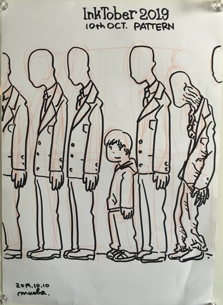 inktober2019 inktober 2019 10 PATTERN 投稿者: murbo 投稿日: 2019/10/102023/03/31 10日目のinktober 2019のお題はPATTERN。パターンは連続するもの、模様や形状などであるが、何をしてパターンとするか毎度のように考えまして、同じような人が同じ格好で並んでいることにしました。同じではない人もいますが、同じポーズをであることだけがパターンになっています。年をとっても同じパターンのままであり、繰り返すものは仕草であったということです。言うほど同じ形ではないのは描いたやつの画力の問題です。 紙に油性ペン。 関連記事: inktober2019改題16。 inktober2019改題16b。 inktober2019改題30。