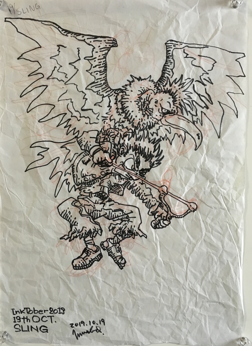 inktober 2019の19日目はSLINGがお題。スリングです。吊り下げるとか投石機とか吊り包帯とか、吊るす意味が多いです。スリングショット(ゴムカン)とスリングパニア―(銀河漂流バイファムというアニメに登場するラウンドバーニアンを総称とする大型ロボットの補助飛行装置)を思いついたので、そのままスリングパニア―を描くのはよくないのでモヒカンの鷹に吊るされてゴムカン(スリングショット)を撃つところにしました。WILDからの西部劇をイメージしています。