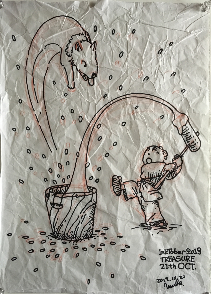 TREASUREは日本語で宝物が21日目のinktober 2019のお題。面倒だったので画像検索して最初に出てきた画像を参考に描く予定でした。しかしでてきたのは宝箱が開いていて財宝がこぼれ出ているようなものでした。それがいくつも続きます。最初を描いても最後を描いても多分同じ宝箱から溢れる財宝を描かなければならず、技量の発表会みたいになってしまう。その様は技量はないのでネタで勝負できるように少し考えました。宝といえば大判小判がザックザクです。大判と小判で出来たザクを描くのも手でしたね。権利関係とかそろそろ気にすべきかと思ったので、別のアイデアを考えます。大判小判がザックザクは童謡があったので、花咲かじいさんを思い出し、この様になりました。色がないとわからりづらいね。