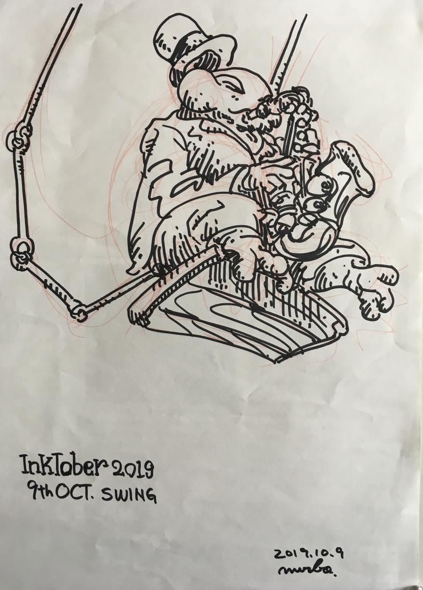 inktober 2019の9日目はSWING。旋回するとかブランコで遊んでるとかジャズでいうグルーヴみたいなこと。日本語のお題では スイング と書かれているために意味がわからない。いや、意味が間違っている場合もあるよね。そんなに厳密なものではなくて、連続して描くためのガイドとしてのお題だろうから硬い話をするだけ意味がないとは思う。しかし、僕は他人の仕様で強制的に描くことで練習にしたいのだ。