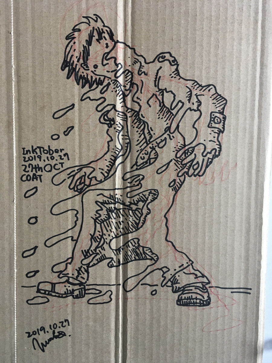 inktober2019 inktober 27 COAT 投稿者: murbo 投稿日: 2019/10/292022/06/05 COATは防寒用の服のコートの他に覆うとか塗りとかそういったもののようなので液体のコートをコートされる人です。inktober 2019の27日目。 紙に油性ペン 関連記事: inktober2019改題14。 inktober 2019 05 BUILD inktober 2019 09 SWING