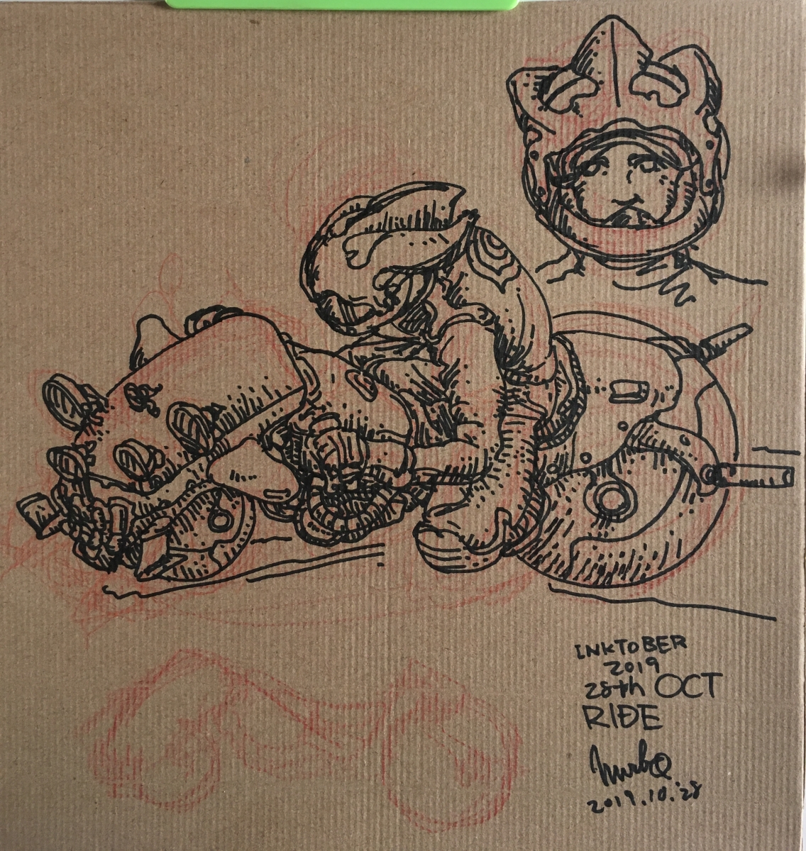 inktober2019 inktober 28 RIDE 投稿者: murbo 投稿日: 2019/10/292022/06/05 28日目のinktoberのお題はRIDE。乗るとか。検索するとバイクが殆どでしたのでバイクに乗っているところを描きました。そもそもこのinktoberはちゃちゃっと描く予定だったのでバイクを描くには僕が知らなさすぎるし、資料を見ながら描くのは時間がかかるので適当な空想バイクを適当に考えてから描きました。ヘルメットも適当にでっち上げています。向こう側の腕の位置がおかしいね。 紙に油性ペン 関連記事: inktober 2019 04 FREEZE inktober 2019 07 ENCHANTED inktober 2019 18 MISFIT
