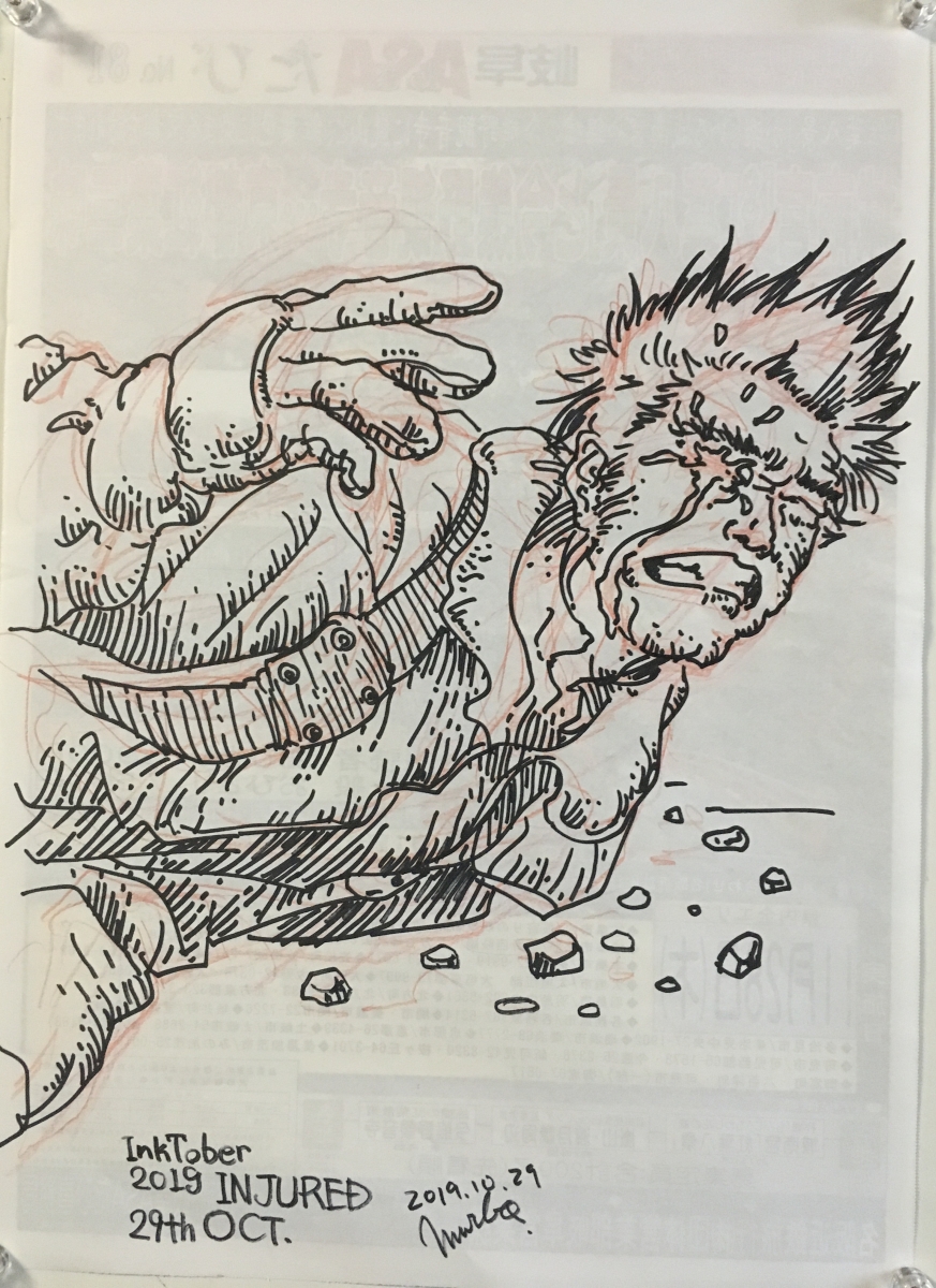 inktober2019 inktober 29 INJURED 投稿者: murbo 投稿日: 2019/10/292023/09/27 29日目のinktober 2019はINJUREDがお題。目を撃たれて倒れた兵士を思いついたので描いた。 その前に思いついたのは包帯をした人だったが、あんまり負傷した感じがしないと思ったので撃たれた直後にしたが、やっぱり描いてみようと思って描いた。 紙に油性ペン 関連記事: inktober2019改題28。 inktober2019改題29。 inktober2019改題31。