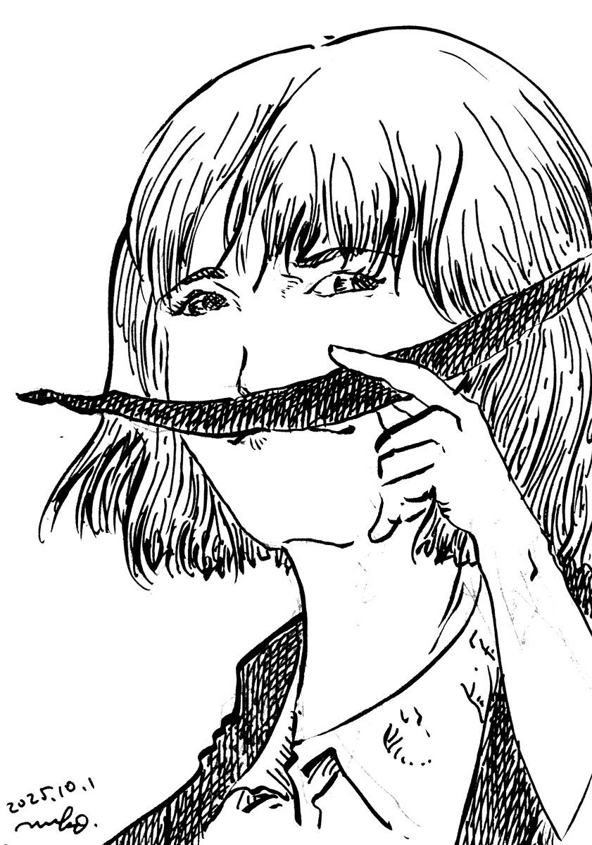 日記 inktober202501 投稿者: murbo 投稿日: 2025/10/012025/10/01 以前、inktoberに参加してどういうことかアクセス数が激減したのでやらなくなったのだが、そろそろ落ち着いてきたのではないかと思ってチャレンジします。今回は写真のL版サイズに筆ペンで描いています。 1日目は『口ひげ』『mustache』 この前の展覧会の感想で字が下手と書かれたので、下手さ加減を見てもらうために字も書きます。展覧会では書いた字は展示していないのだがな。 関連記事: 去年にinktoberにチャレンジしたら inktoberをやるよ、など。 inktober 2022 paint 10.