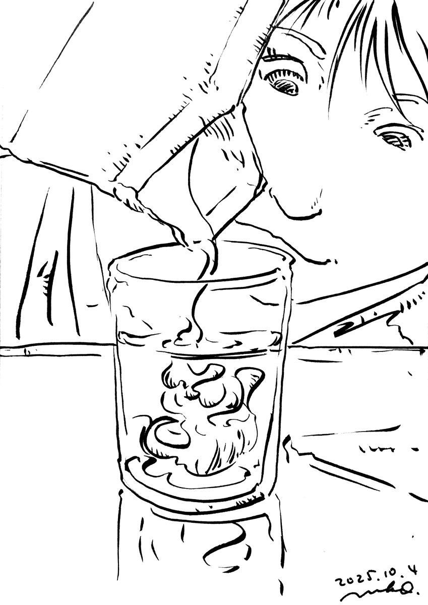 日記 inktober202504 投稿者: murbo 投稿日: 2025/10/042025/10/04 四日目は『濁った』『murky』コップの中身と牛乳パックは一旦実物をスケッチしました。 スケッチは実物より大きいのでなんか感じです。絵のサイズは写真のL版。画材は筆ペン。文字も同様です。あ、サイズはさらに一回り小さい。 関連記事: inktober202501 inktober202502 inktober 202503