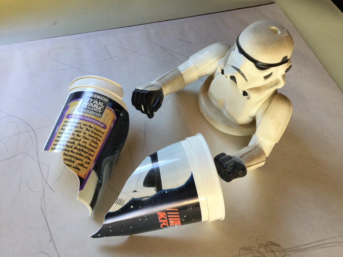 で、このストームトルーパーのついたカップは模型を作っている工房にいた頃に社長にもらったものです。これまであまり丁寧には保管していなかったものの、所謂日陰には置いてありました。二十年以上かもっとなのか経た今になって棚を不意にゆすってしまい、これが倒れたのです。その際に蓋が外れました。まぁ、何十年もたっているので仕方がないと思いました。そして手に取るとどんどん蓋の縁が壊れ、粉々になりました。この材質ならではだと思います。名前がわからないが。そしてカップを持って、仕方がないので接着するかと思ったとたんにあっさりパリンと割れました。破片は飛び散り、そのうちのいくつかは粉々になりました。ソフビフィギュア部分は問題がないようです。カップ部分はどうすることもできませんがフィギュアだけでも上手い事保管しようと思います。やっぱり塗装したほうが長持ちはするっぽい。