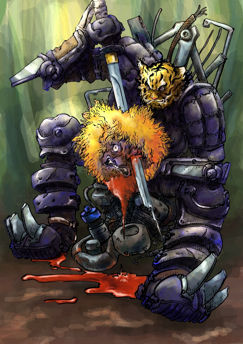 Picture KING TIGER 2022 投稿者: murbo 投稿日: 2022/01/012022/01/01 描いてから気がついたのは刀の向きが逆だった。なんで年明けから物騒な感じになっているかと言うならば、虎といえばキングタイガーだよな、でもライオンいるし、どうしたものかと思って、ライオン(怪人)を倒してkingになった虎にした。 最初に描いたキングタイガー。顔とかポーズが嫌だなと思って描き直したものの、デジタル化はしていたのでモノトーンで塗った。これはこれでいいかなと思った。 紙に筆ペンとボールペンのドローイングにProcreateで彩色。 関連記事: 仕事で描いた…はず。 続編はNGになった。 TIGER MAN