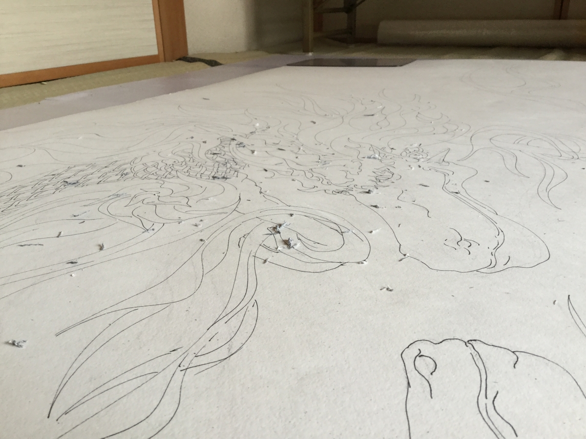 麒麟(大)制作の三日目。消しゴムかけ。広いので消すだけでひと仕事です。