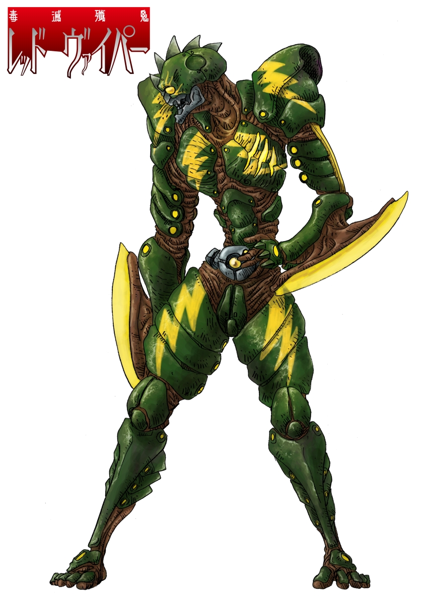毒滅殲鬼レッドヴァイパー LEDVIPER RAIKA 181228 投稿者: murbo 投稿日: 2019/01/042022/06/23 レッドヴァイパー ライカを記憶スケッチせず、以前描いたものを参考に描いた。ただただ形を忘れないように描いている。黄色の模様は新たに考えたほうがいいな。まだらというかもっと自然なギザギザがいいな。腕の刀は通常の形でなく、絵のように高速移動で相手と間合いを詰めて戦えるようにコンパクトでやや後退した形に変形する。格闘するように刃物で戦うには短いほうがやりやすそうなので。刀の長さのベストは何かということでなくて。 シャープペン0.9mmのドローイングにprocreate(iOSアプリ)で着色。 Readers who viewed this page, also viewed:LEDVIPER 190117 関連記事: LEDVIPER raika 181016 LEDVIPER raika 181113 LEDVIPER 190117